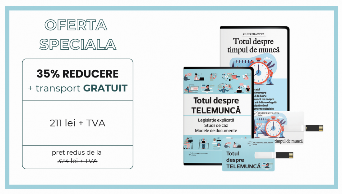 Aflati din ghidul nostru – Totul despre telemunca – cum sa evitati sau sa gestionati corect toate situatiile sensibile care pot aparea. Ghidul contine legislatie explicata, modele de documente precum si numeroase studii de caz!